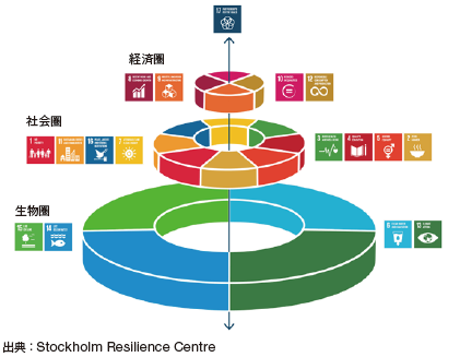 ウェディングケーキモデルで17のゴールを分類した三つの層「経済圏」、「社会圏」、「生物圏」は、SDGsの核となる三つの要素「経済、社会、環境」にあたります。2030アジェンダでは、持続可能な開発を達成するためには、経済、社会、環境の三要素を調和させることが必須であると明記されています。ただし、ウェディングケーキモデルでわかるように、環境の持続可能性がすべての持続可能性の大前提です。