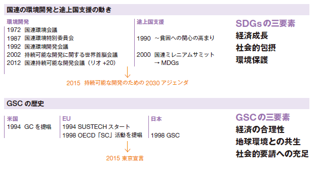 同じ頃、日本でも持続可能な開発に向けてのグリーンケミストリーの取り組みが始まり、1998年に環境負荷低減と持続可能社会を組み合わせて「グリーン・サステイナブル ケミストリー(GSC)」と名付けられました。その後、2015年には第7回GSC国際会議で「