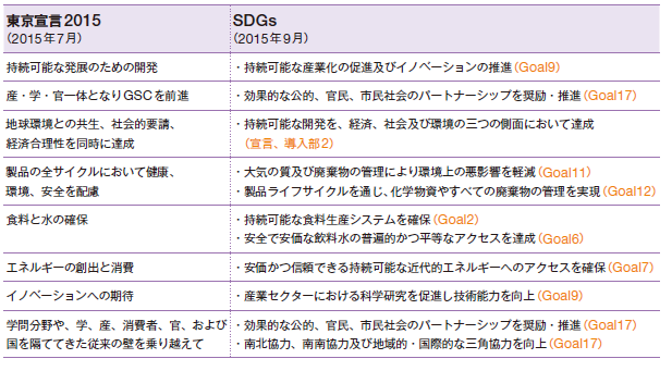 東京宣言2015」は、世界で連携してGSCに取り組むことを表明したものです。東京宣言に記されたGSCの理念とSDGsを比べると、多くの類似点があることがわかります。以下に示した東京宣言のSDGsと対応する部分の一部を黄色で示しています。