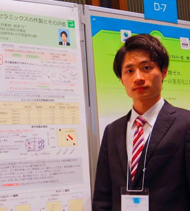受賞できたことを大変光栄に思います。ポスター発表中は様々なバックグラウンドを持つ方々と議論することができ、今後の研究指針を定める上で有意義な時間となりました。私自身、廉価なセラミックスを「がん免疫療法」に応用できれば非常に画期的だと考えております。開発した材料のさらなる有用性を明らかにし、将来的には産学共同で実用化へのステップを踏みたいです。 |