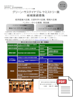 グリーン・サステイナブル ケミストリー(略称:GSC、詳細はこちら)の推進に貢献する優れた業績を挙げた個人、団体を表彰いたします。奮ってご応募下さい。再応募も歓迎いたします。